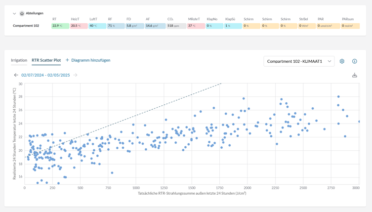 Das RTR (Radiation-Temperature Ratio) Streudiagramm in Priva Operator ist ein leistungsstarkes Tool, das Produzenten bei der Kontrolle und Optimierung des Gewächshausklimas unterstützt. Durch die Darstellung der täglichen RTR-Werte als Punkte in einem Streudiagramm kann die Beziehung zwischen Strahlung und Temperatur in Echtzeit visualisiert werden. Ihre 24-Stunden-Temperaturstrategie wird als dynamische Ziellinie dargestellt, so dass Sie sofort sehen können, ob die aktuellen Bedingungen geeignet sind, Ihre Ziele zu erreichen. Wenn Sie Anpassungen vornehmen, z. B. die Lüftung erhöhen oder die Heizpläne ändern, wird die Ziellinie automatisch aktualisiert, so dass gewährleistet ist, dass Ihre Entscheidungen immer auf den neuesten Dateninformationen beruhen.