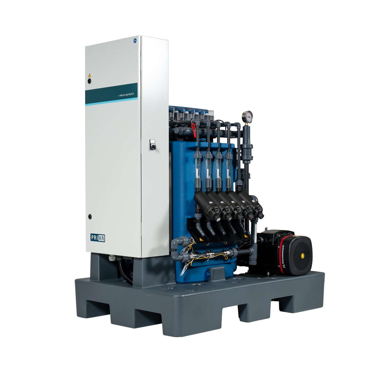 El Priva NutriFit puede ser utilizado con todos los tipos de sistemas de riego (aspersión o goteo, sistemas de inundación y drenaje). La acidez se puede ajustar con ácido o lejía para lograr el valor óptimo de pH. El Priva NutriFit está disponible para capacidades que van desde 5 a 25 metros cúbicos por hora (22 a 110 gpm). Se puede hacer una selección de bomba para adaptarse a sus necesidades específicas en cuanto a capacidad y presión. El Priva NutriFit es fácil de integrar en configuraciones existentes y proporciona soluciones eficientes para operaciones de tamaño pequeño a mediano.